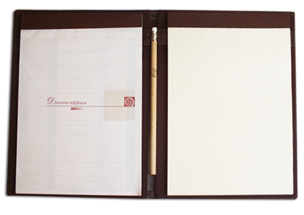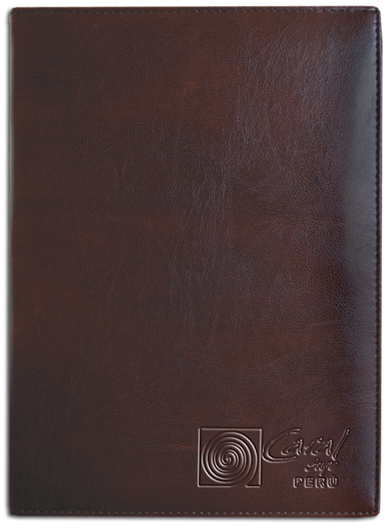Cuaderno de Notas de Caral Con directorio telefónico y block - Formato A5 - Tapa dura forrada con cuerina de color marrón y cosida.