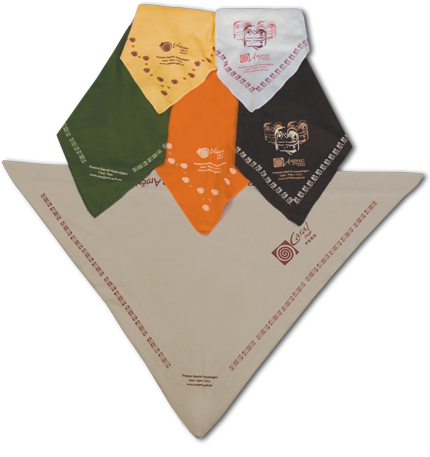 - De gamuza pima 50/1 - Corte triangular - Con impresión serigráfica de iconografías y logos - Colores: anaranjado. verde amarillo, blanco, y marrón.