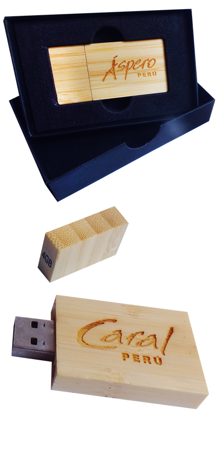 Usb flash drive Áspero y Caral, elaborado en bambú, de 4 GB de capacidad. Viene en estuche negro.