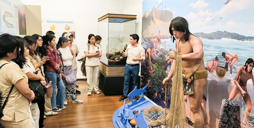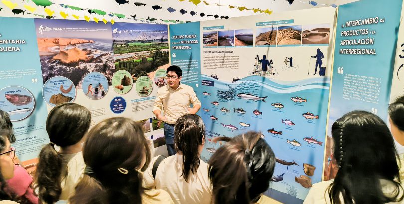 La exposición presenta una importante colección de piezas arqueológicas y elementos de la tecnología pesquera desarrollada hace cinco milenios, como redes, anzuelos y otros instrumentos. La mayoría de estos materiales procede de Áspero, antigua ciudad pesquera de Caral, y evidencia las técnicas empleadas para la captura de diversos recursos marinos, información que despertó gran interés entre las estudiantes de la carrera de Nutrición.