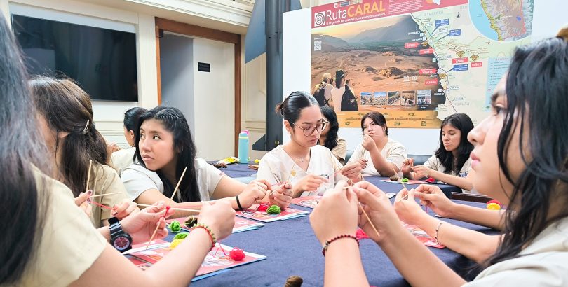 Asimismo, las visitantes participaron en el taller de elaboración de “Ojos de Dios”, como parte del programa Caral para Todos. Guiadas por la responsable de la actividad, Mariela Crespo Crisanto, elaboraron estos objetos que, en la Civilización Caral, tuvieron un importante valor simbólico y social.