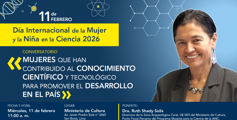 En el marco del Día Internacional de la Mujer y la Niña en la Ciencia 2026, este 11 de febrero, a las 11:00 a. m., en el Ministerio de Cultura se realizará el conversatorio «Mujeres que han contribuido al conocimiento científico y tecnológico para promover el desarrollo en el país», en el que la doctora Ruth Shady Solís, destacada arqueóloga y directora de la Zona Arqueológica Caral, brindará una ponencia especial.