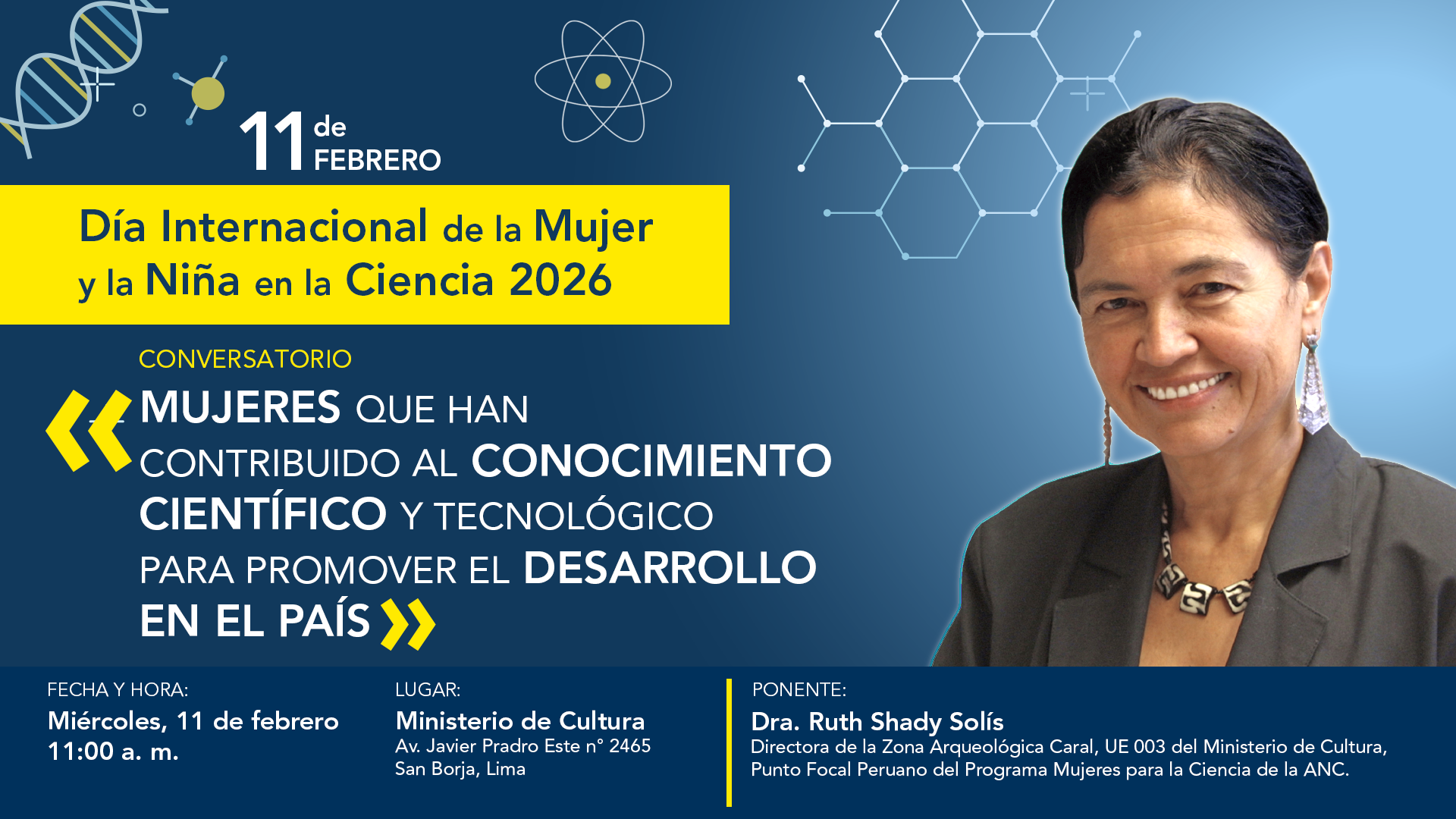 Niñas y jóvenes tendrán la oportunidad de conversar con la destacada arqueóloga. En el marco del Día Internacional de la Mujer y la Niña en la Ciencia 2026, este 11 de febrero, a las 11:00 a. m., en el Ministerio de Cultura se realizará el conversa ...
